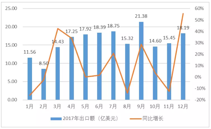 从单月出口趋势来看,自2月开年以来,广东LED出口保持稳步增长态势,8月出口下滑,9月迅速增长至全年LED出口额峰值,10月为2017年下半年单月出口额最低,随后逐步回升至正常水平,12月LED出口额较去年同比增长23.61%,全年总体成绩表现良好。